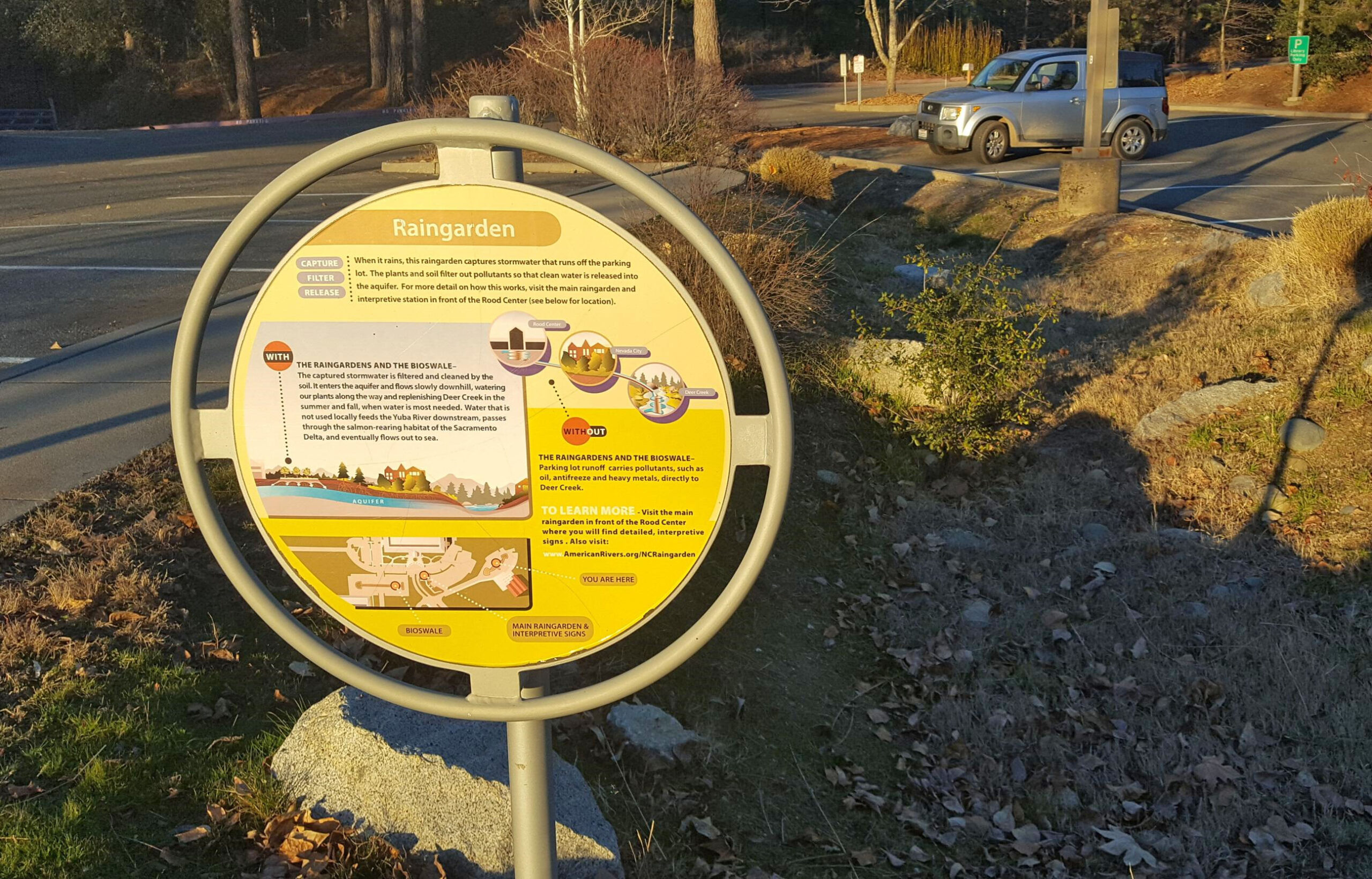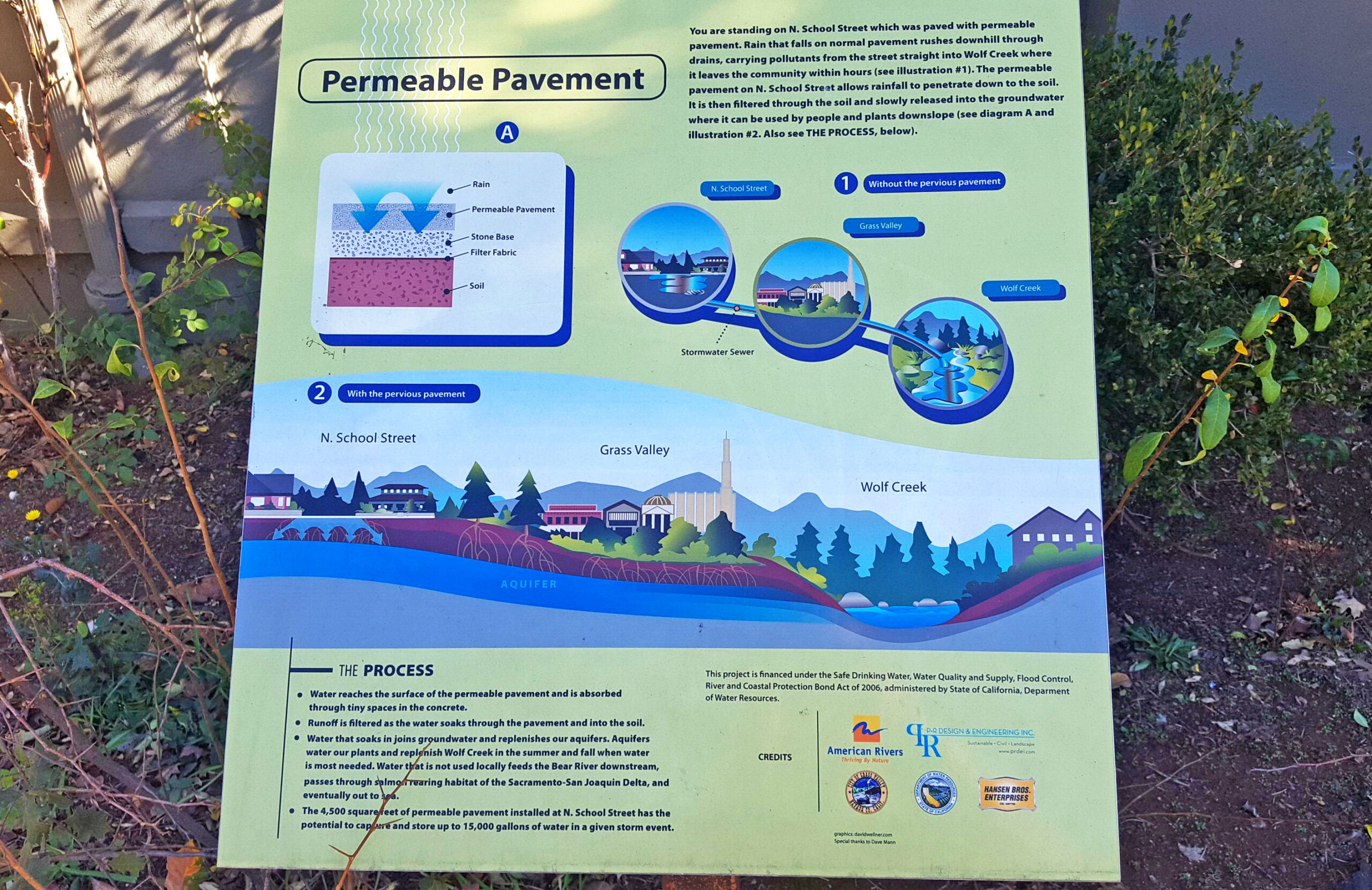 Photo Scavenger Hunt Hints: Nevada County Rood Center in Nevada City, California. Permeable Pavement in Grass Valley, California. Rain Gardens, Nevada City, CA. American Rivers. School Street Grass Valley.