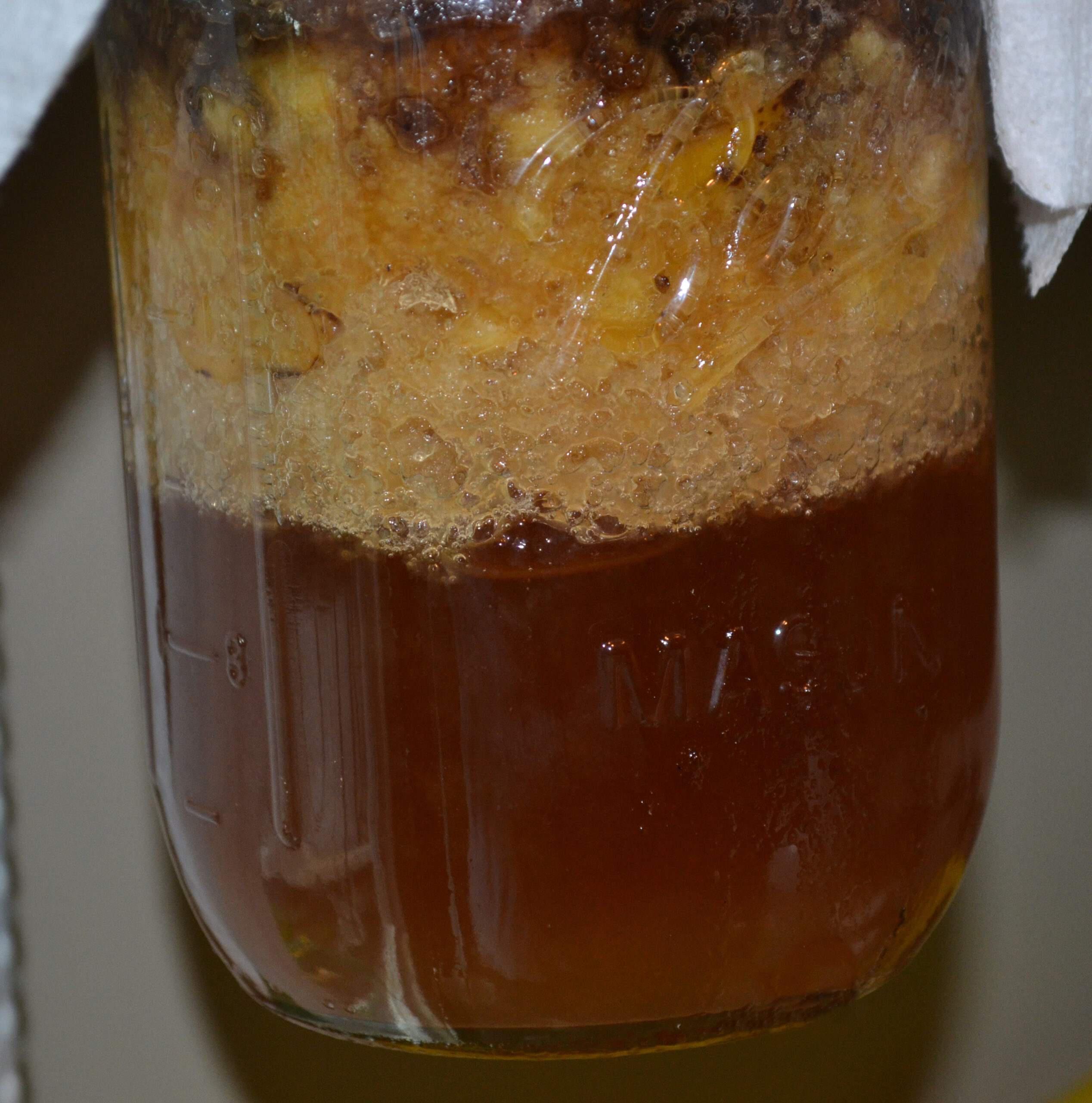 - Use strainer and gather liquid on the bottom, then place into clean mason jars, semi-tighten lids.